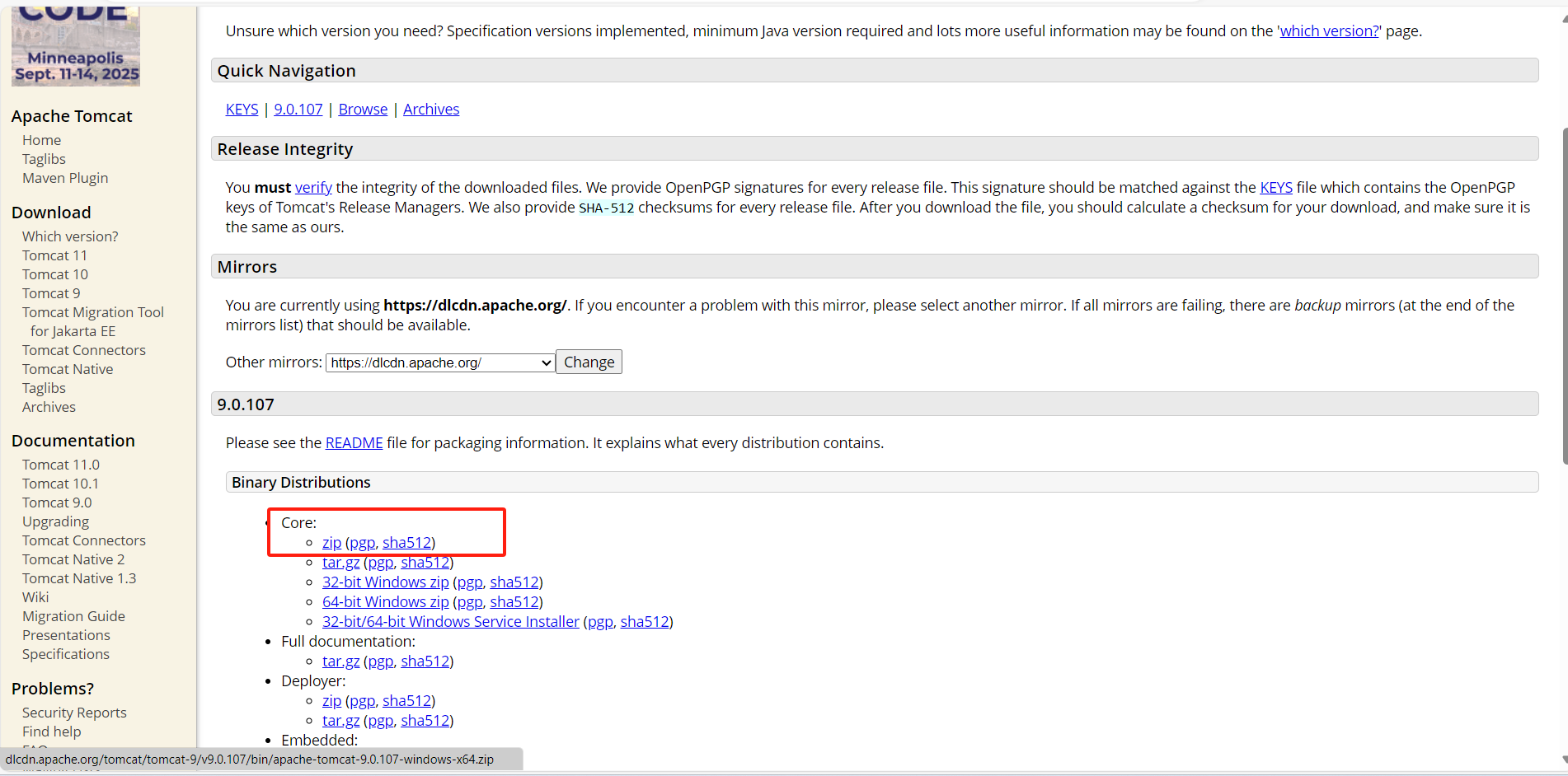 🍕🍕🍕然后我们在左侧的版本中选择Tomcat9,最新版本是Tomcat11但是小编不建议安装,因为最新版本遇到问题相关的教程少,会出现很多麻烦,新版本引入的API对我们的实际开发影响也不大,点击Core下面的zip版本就会开始下载