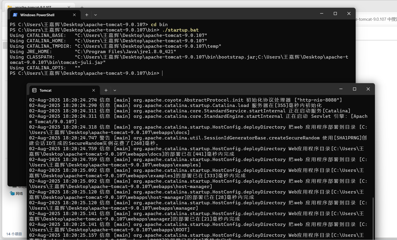 下图是我们在Windows11系统的powershell中启动Apache Tomcat的启动成功后的运行图