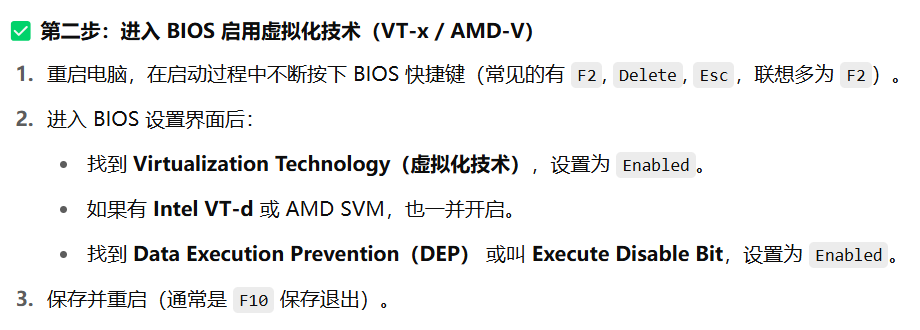 这是因为 Docker Desktop 需要启用 虚拟化技术(Virtualization) 和 数据执行保护(DEP),但目前系统检测不到这些功能。