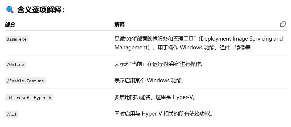 是用来在当前 Windows 系统中启用 Hyper-V 功能的官方命令行方式。