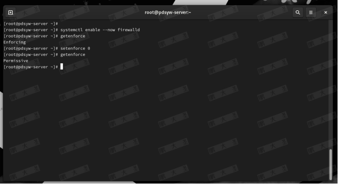 [root@pdsyw-server ~]# systemctl enable --now firewalld [root@pdsyw-server ~]# getenforce [root@pdsyw-server ~]# setenforce 0 [root@pdsyw-server ~]# getenforce