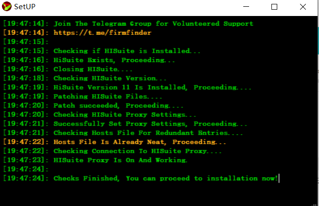 3、点击代理软件界面SETUP按钮,等待Checks Finished完成,华为手机助手会自动关闭