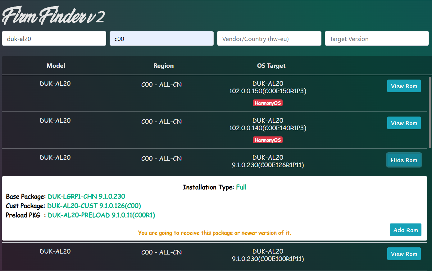 4、选择对应的固件,这里需要注意第一个是手机型号,第二个是地区,一般建议选择手机升级鸿蒙系统前的最后一个EMUI版本,其他版本可能会存在丢快充和USB的情况;选择适合的版本的点击Add Rom成功会在左下角提示Success