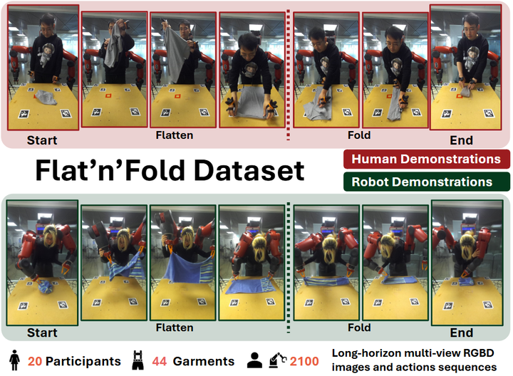 类似地,A. Longhini等综述也强调需要跨织物种类的通用表示,以突破当前方法各自为政的局限iri.upc.edu。研究者还构建了大规模多模态数据集来辅助学习泛化表示。2024年发布的Flat’n’Fold数据集包含1212次人示范和887次机器人示范,覆盖44种衣物,从皱成团到折叠完成全过程,多视角RGB-D、点云和动作同步记录(如下图)。它建立了抓取点预测和子任务分解的benchmark,评测发现现有模型还有显著提升空间。如此丰富的数据对于训练能够“一通百通”的布料状态识别模型至关重要。