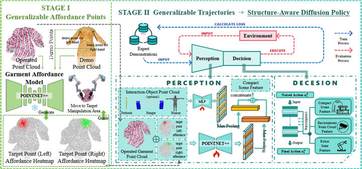 此外,北大和UC伯克利合作推出了DexGarmentLab环境,专注于灵巧手与衣物互动。DexGarmentLab包含2500+衣物模型和15种双手协调任务(如悬挂上衣、戴帽子、系围巾等)arxiv.org。它采用层次结构的HALO策略(如下图),实现了在类别级别泛化的双手操控,每种任务只需单次示范即可自动生成大量变形轨迹数据用于训练。实验显示HALO相比现有方法在不同衣物形变下的成功率有显著提升。这些仿真平台的推出大大降低了研究门槛,世界各地的团队都可在统一环境下测试算法,为公平比较和复现提供了基础。