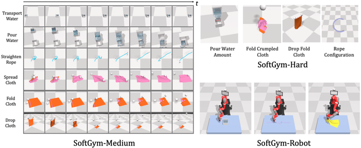 2021年,SoftGym是一套在NVIDIA FleX引擎上构建的变形物体操作基准环境,包含布料折叠、展开、抹平等多种任务danieltakeshi,CoRL。
