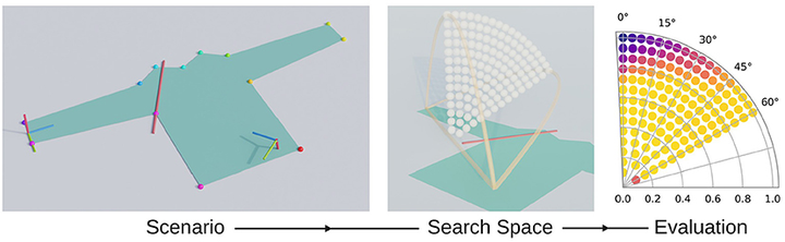 Method overview: a selected scenario (left) for which a search space is automatically set up (middle) and which is subsequently evaluated (right).