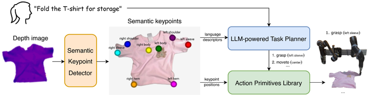 又如,Deng等提出CLASP框架,通过语义关键点连接LLM任务规划和低级动作执行,实现了“折叠、铺平、挂起、摆放”等多任务统一操作。从深度相机图像提取衣物的语义关键点(如“左袖口”、“领口”),LLM据此规划步骤,再由控制模块完成动作。该方法在仿真中对不同衣物和不同任务均取得优于基线的表现,并在真实双臂机器人上成功完成多种衣物操作任务arxiv.org。