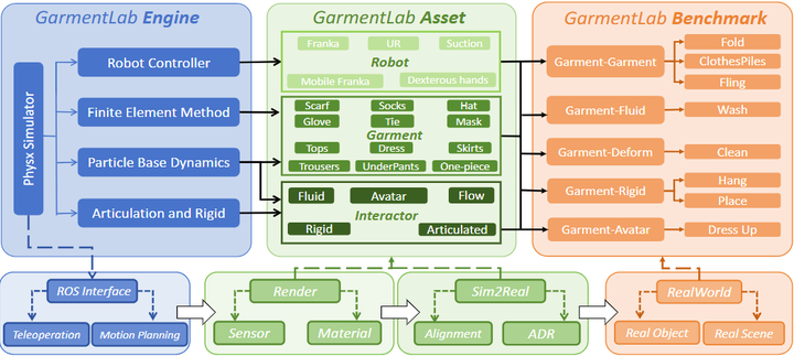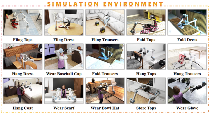5. 仿真平台、数据集与开源工具:最近的研究,支撑布料操作研究的公共资源更加丰富完善,推动了领域发展和成果复现。首先,各种布料仿真环境不断涌现并开源:之前提到的SoftGym github 基于粒子弹性模型提供了多种布料任务,而北京大学等发布的GarmentLab进一步引入了有限元法(FEM)和流体模拟,实现更高逼真度的布料-刚体、布料-流体交互仿真arxiv.org。GarmentLab涵盖了从衣物清洗(布料与流体)到穿衣(布料与人体)等丰富场景,提供多种仿真方法切换,并附带了与真实扫描对象对应的benchmark。它在多项布料操作任务上评测了视觉、强化学习、模仿学习算法,指出当前方法在泛化性上的不足arxiv.org。