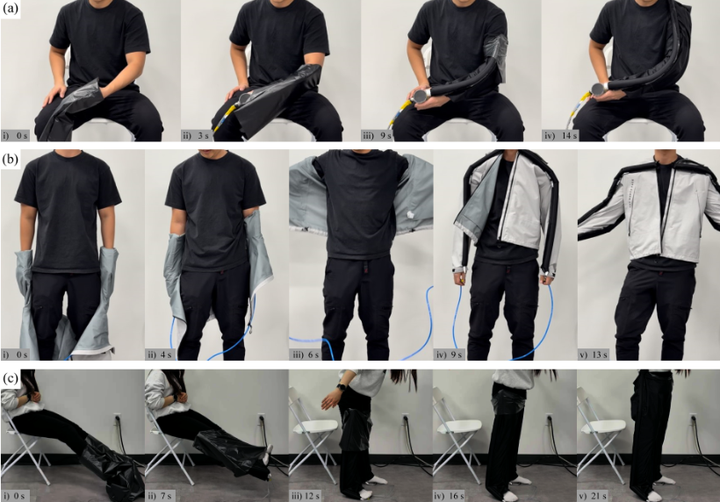 可穿戴智能织物也是一大融合方向:一些研究探索让衣物本身嵌入传感和致动元件,实现自适应形变,例如2025年有工作提出由软体致动展开自卷的衣服,从而辅助机器人的穿衣操作(如下图的Self-Wearing Adaptive Garment (SWAG))arxiv.org。这些跨领域结合为解决布料操作中的特殊难题提供了新思路。