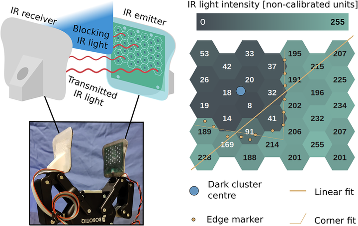 UnfoldIR 9 tactile sensors. One fingertip emits infrared (IR) light, the other receives it. A grasped layer of cloth reduces the light captured by the receiver grid, as can be seen in the exemplary sensor readout (right).
