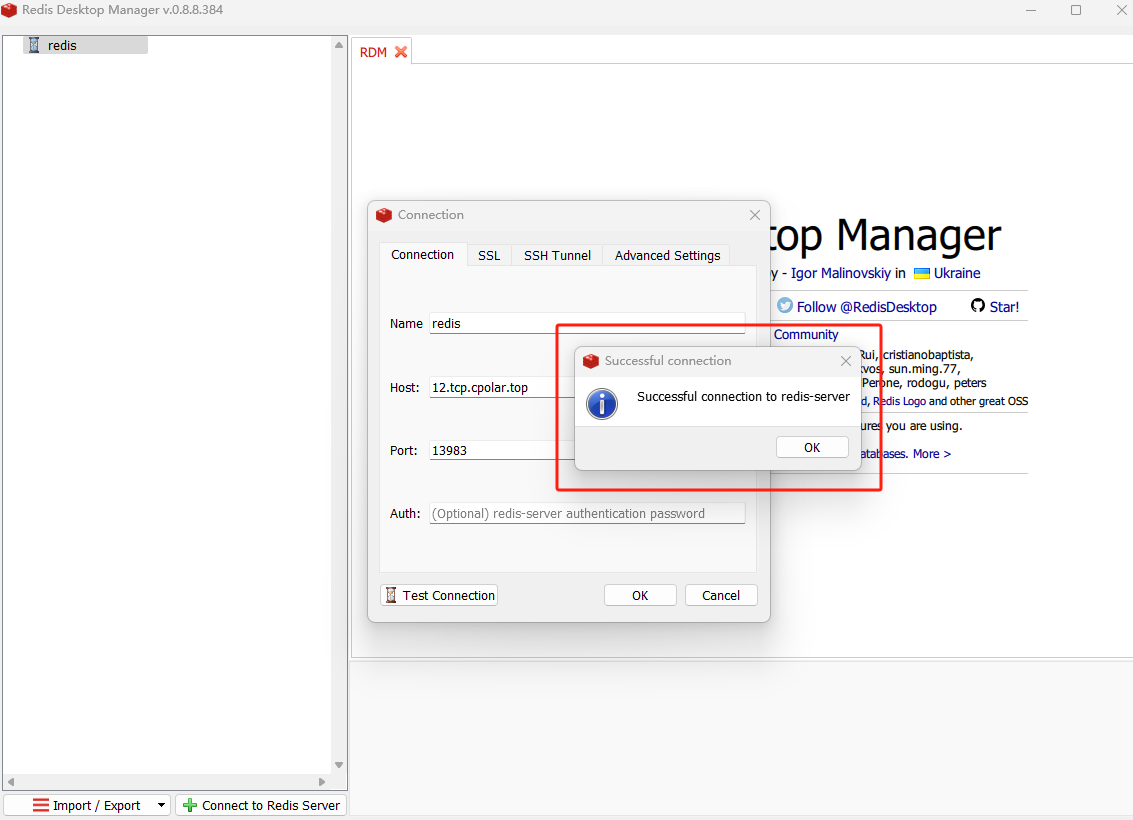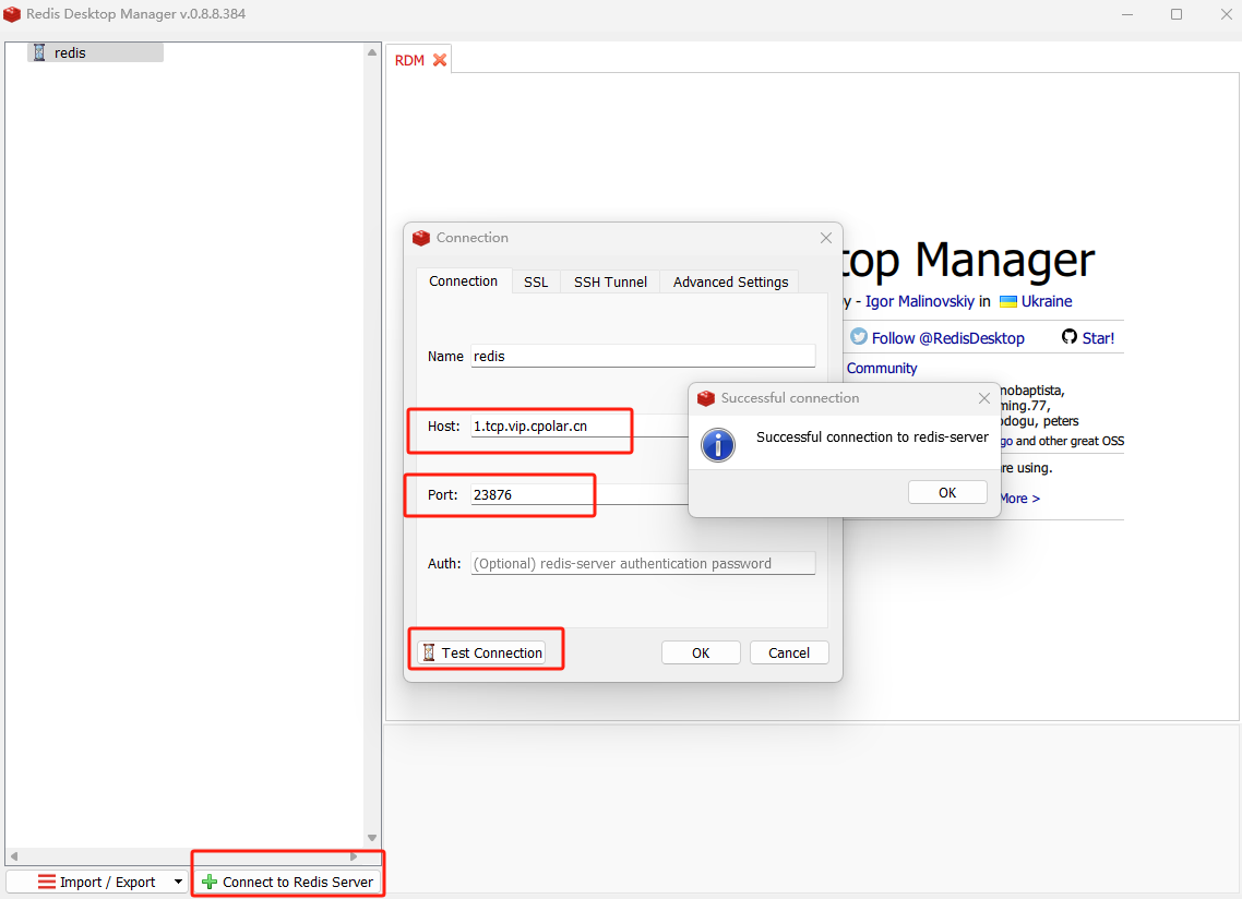 输入后点击连接测试,如看到弹出框提示成功连接,即本地连接redis测试成功。