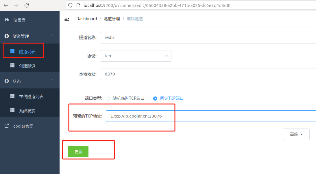 修改隧道信息,将刚才保留成功的固定TCP地址配置到隧道中