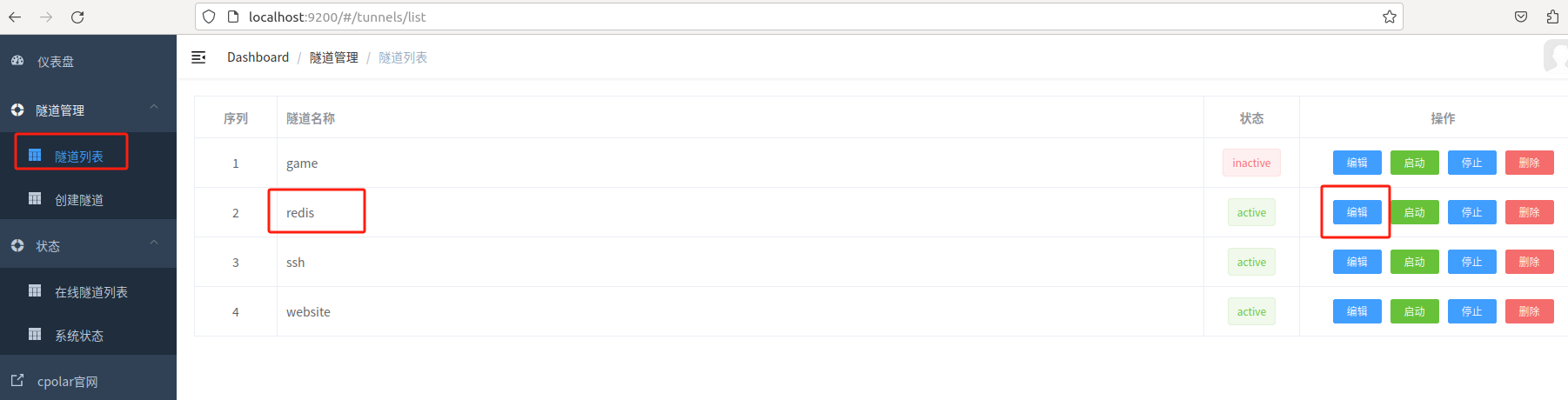 地址保留成功后,复制生成的公网地址,打开cpolar web ui管理界面,点击左侧仪表盘的隧道管理——隧道列表,找到我们刚才创建的随机公网地址隧道 redis,点击编辑