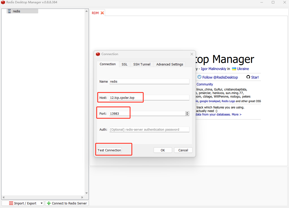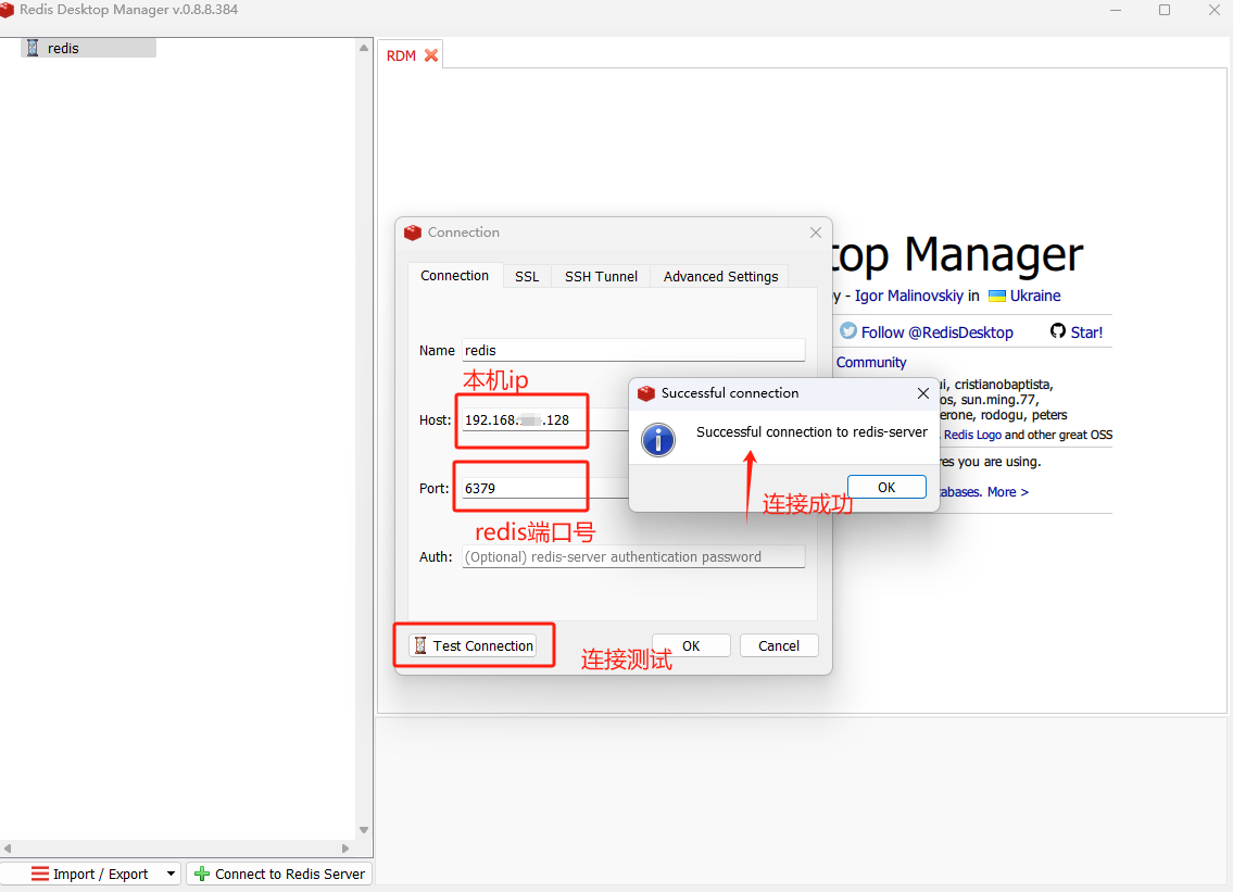 在弹出的窗口中,需要填入本机ip地址和redis的端口号: