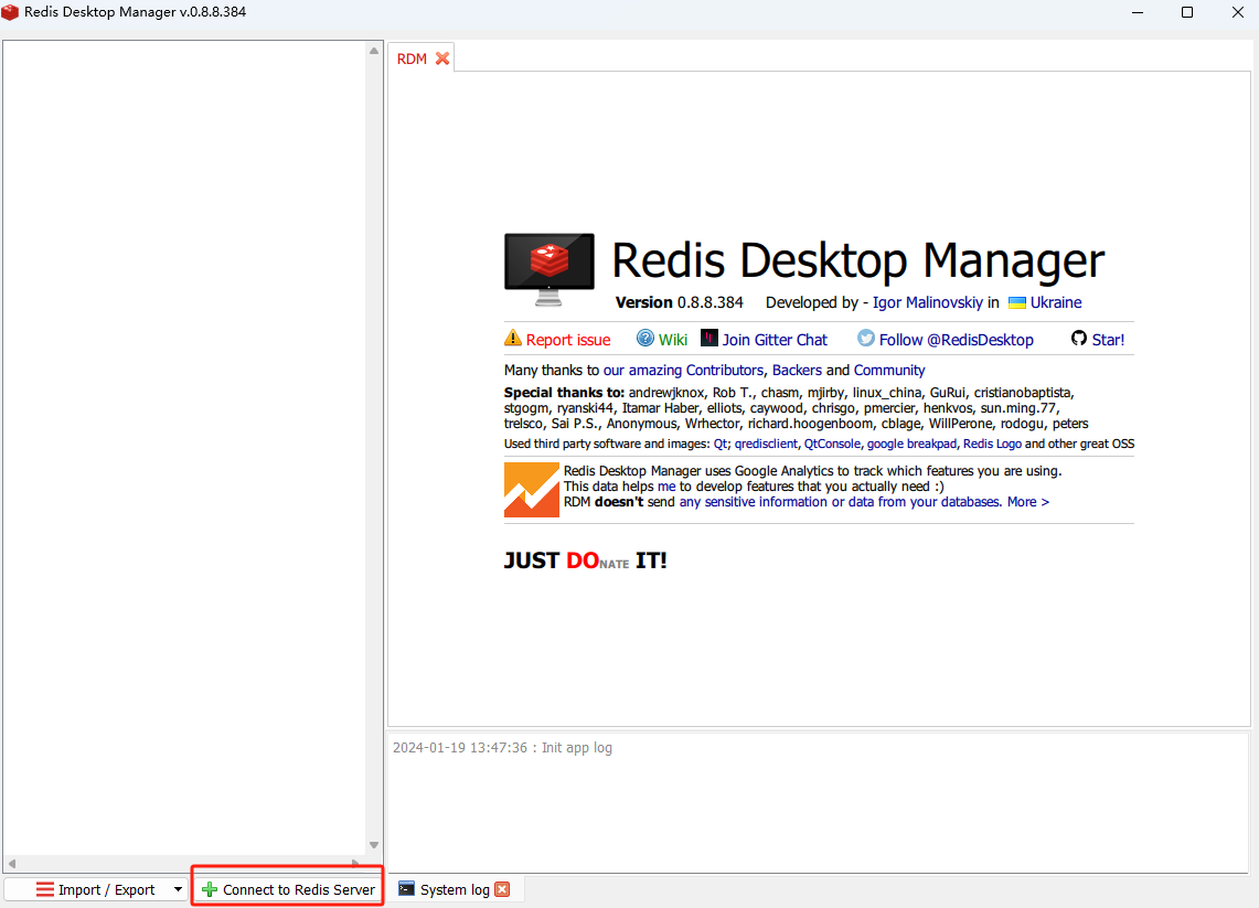默认安装完成后,点击左下红框位置的连接redis server按钮: