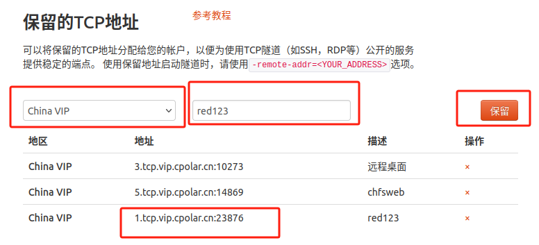 - 预留的TCP地址:复制粘贴官网保留成功的地址,本例中为:1.tcp.vip.cpolar.cn:23876