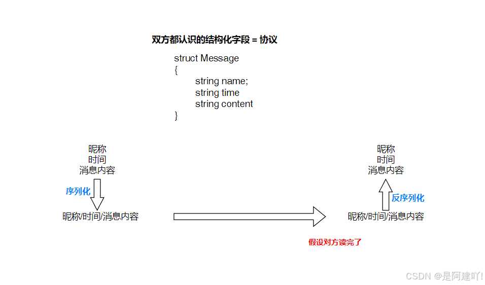 我们在生活中与朋友聊天时,发送给朋友的有头像、昵称、时间、消息内容等等,这里我们就以昵称、时间和消息内容举例,我们给朋友发送的消息,需要通过服务器转发,假设我们的昵称、时间和消息内容是分开发送的,但是通过服务器转发的客户端并不只有我们一个人,这样可能会导致昵称、时间和消息内容随意组合,所以发送给服务器的信息通常是将昵称、时间和消息内容以特定形式组成的字节流(“字符串”),然后服务器将字节流转发给我们的朋友,这里我们假设朋友的机器读完了整个字节流,由于我们和朋友的机器都知道昵称、时间和消息内容的组成方式,它就可以从字节流中提取出昵称、时间和消息内容来。