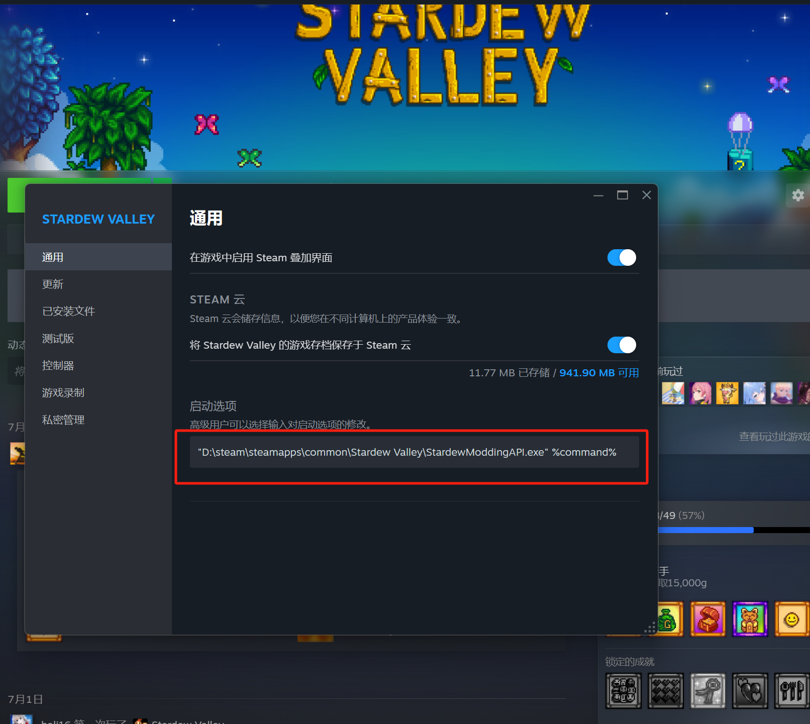 在steam游戏库中找到星露谷,右键打开属性,在启动选项粘贴这一行内容