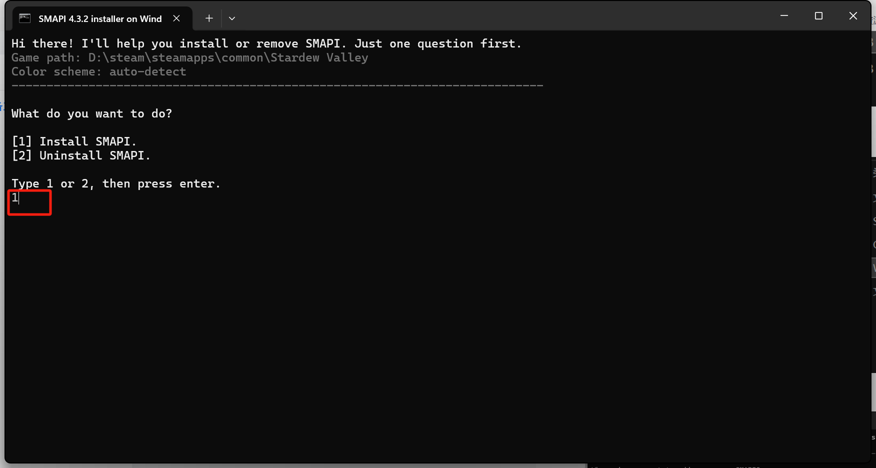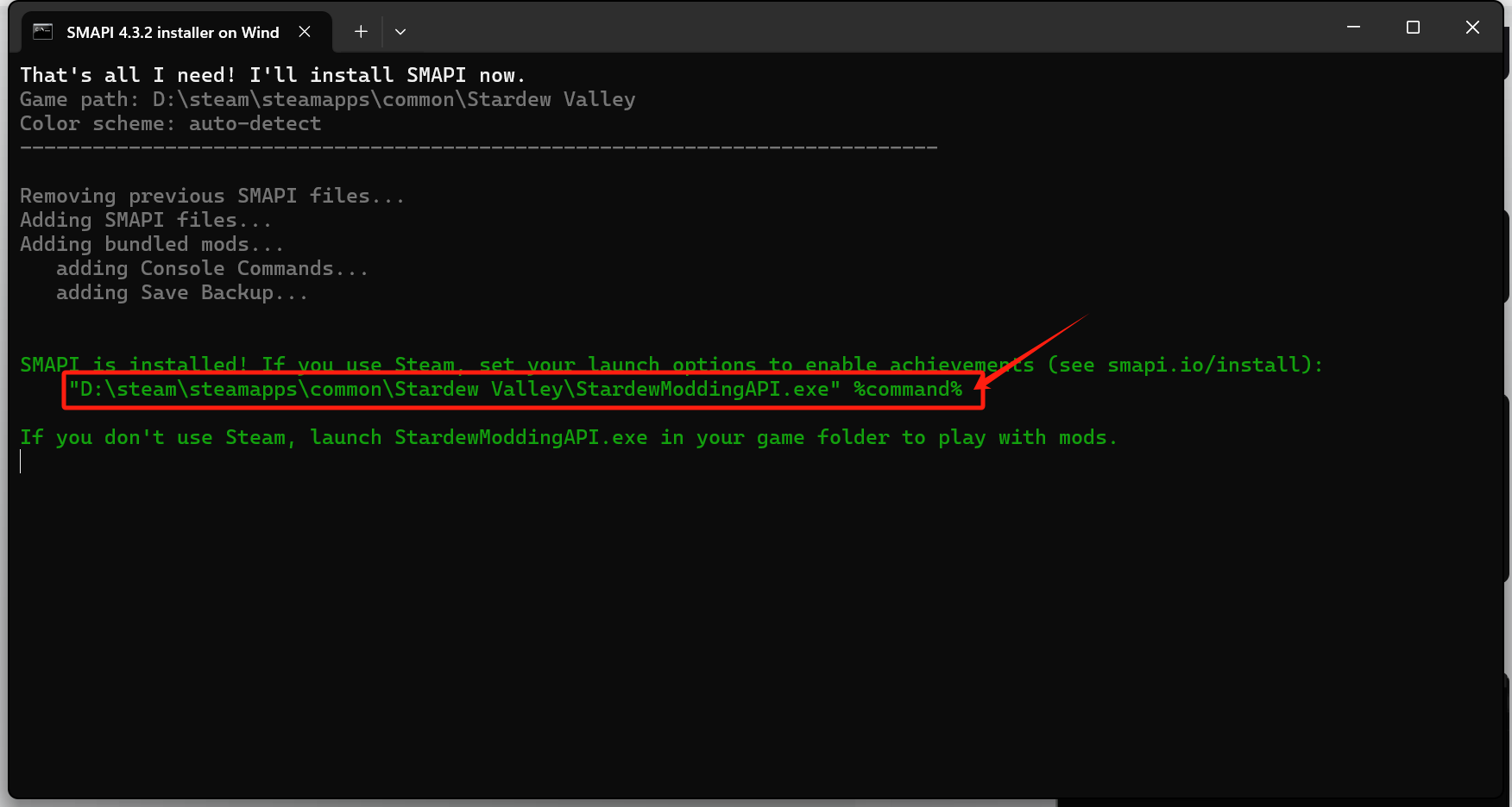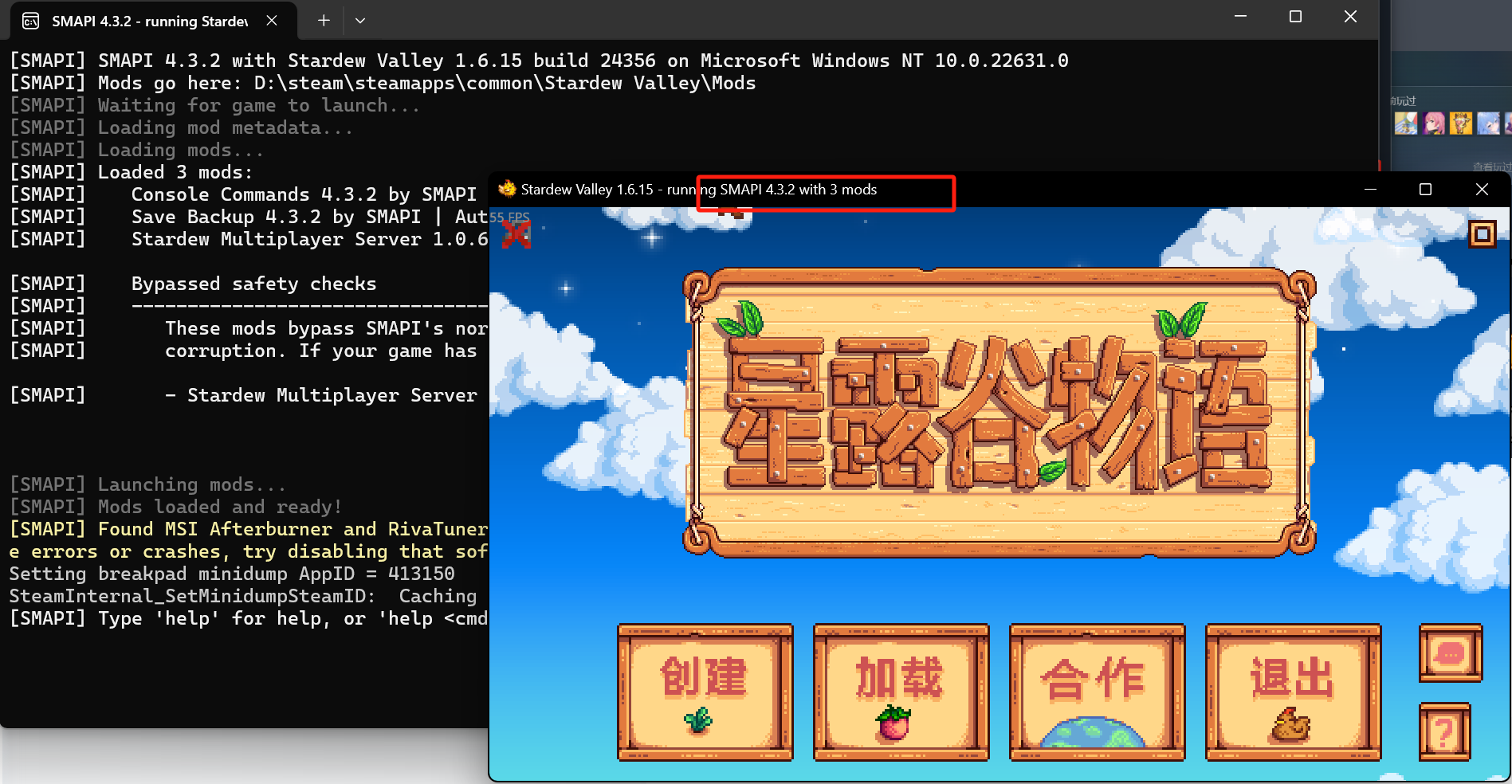 此时你会发现弹了个黑底色窗口,游戏的窗口会显示smapi字样,说明安装成功了