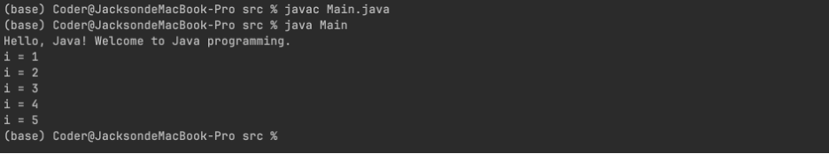 由于程序名为Main.java,因此,在这第一个Java示例应用程序中,设计屏幕输出字符串为“Hello, Java! Welcome to Java programming.”并带有一系列 i 数值在屏幕输出。