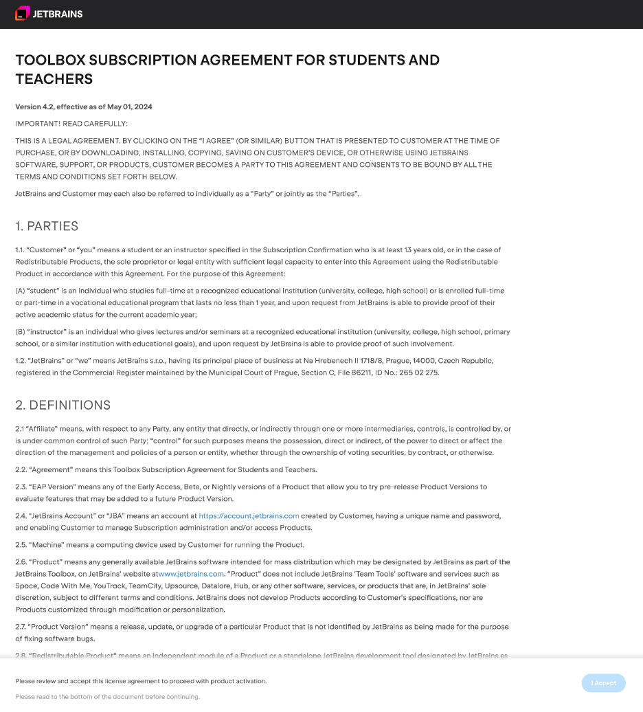阅读完毕后,点击Accept(接受)。同时,为了安装软件,需提前下载IntelliJ IDEA Ultimate软件包到本地电脑。