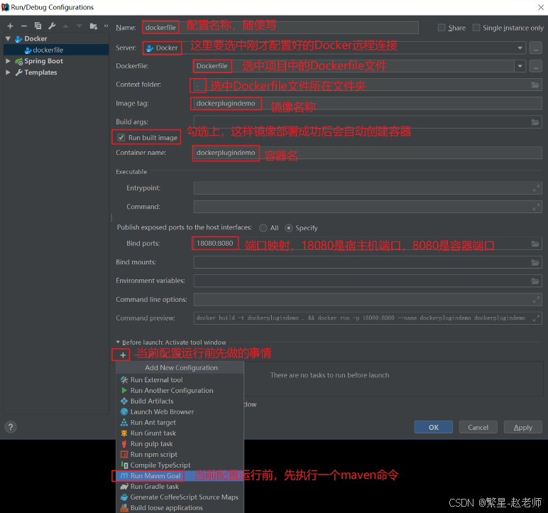 在"Run Maven Goal"中输入 clean package,表示每次构建镜像之前都会清理并重新编译构建: