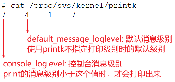 default_message_loglevel = 3,默认情况下,内核会处理消息为KERN_ERR级别。
