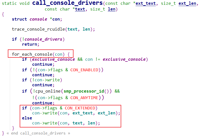 CON_EXTENDED标志位。如果控制台支持扩展格式(CON_EXTENDED),则调用con->write函数,将扩展文本内容ext_text写入控制台。con->write(con, ext_text, ext_len);:控制台的write函数负责将日志内容输出到实际设备上,例如终端、串口等。这里传递的是扩展格式文本。