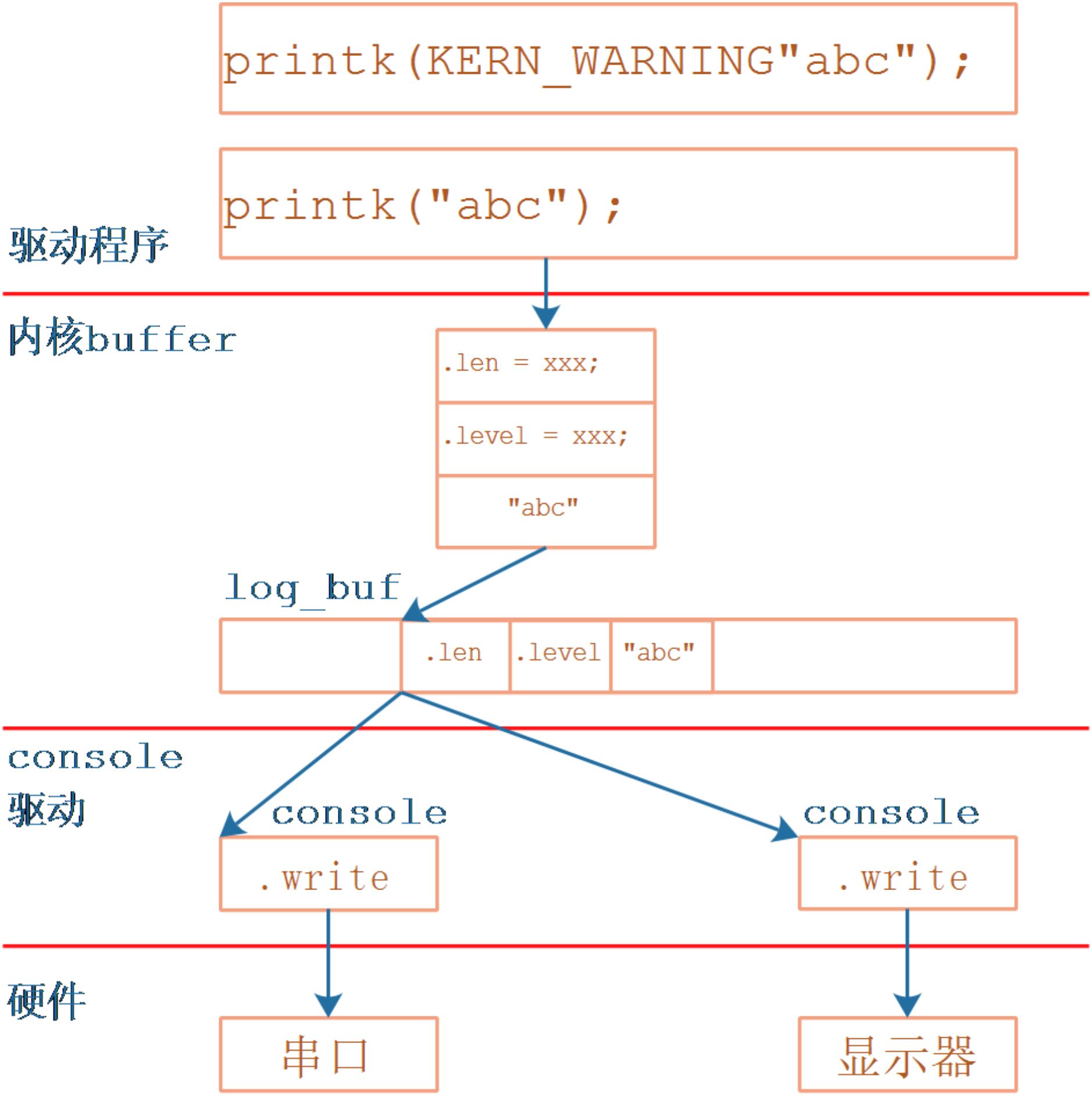 在嵌入式Linux开发中,printk信息常常从串口输出,这时串口被称为串口控制台。从内核kernel/printk.c的printk函数开始,往下查看它的调用关系,可以知道printk函数是如何与具体设备的输出函数挂钩的。