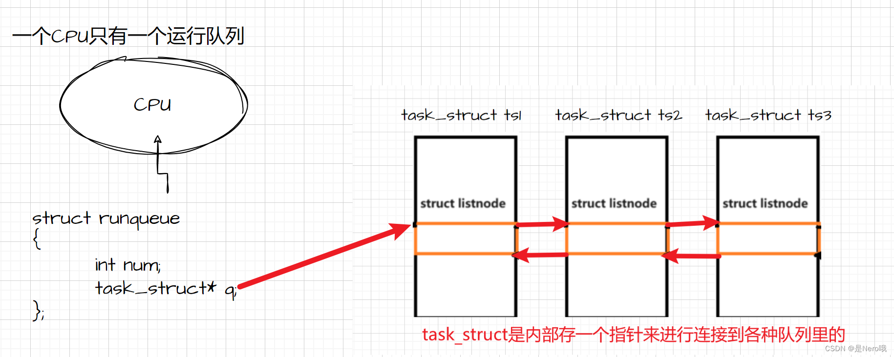- 在操作系统中,为了有效地管理进程的调度和执行,通常会为每个 CPU 维护一个运行队列。这个运行队列存储了当前可运行的进程,即那些已经准备好被 CPU 调度执行的进程。