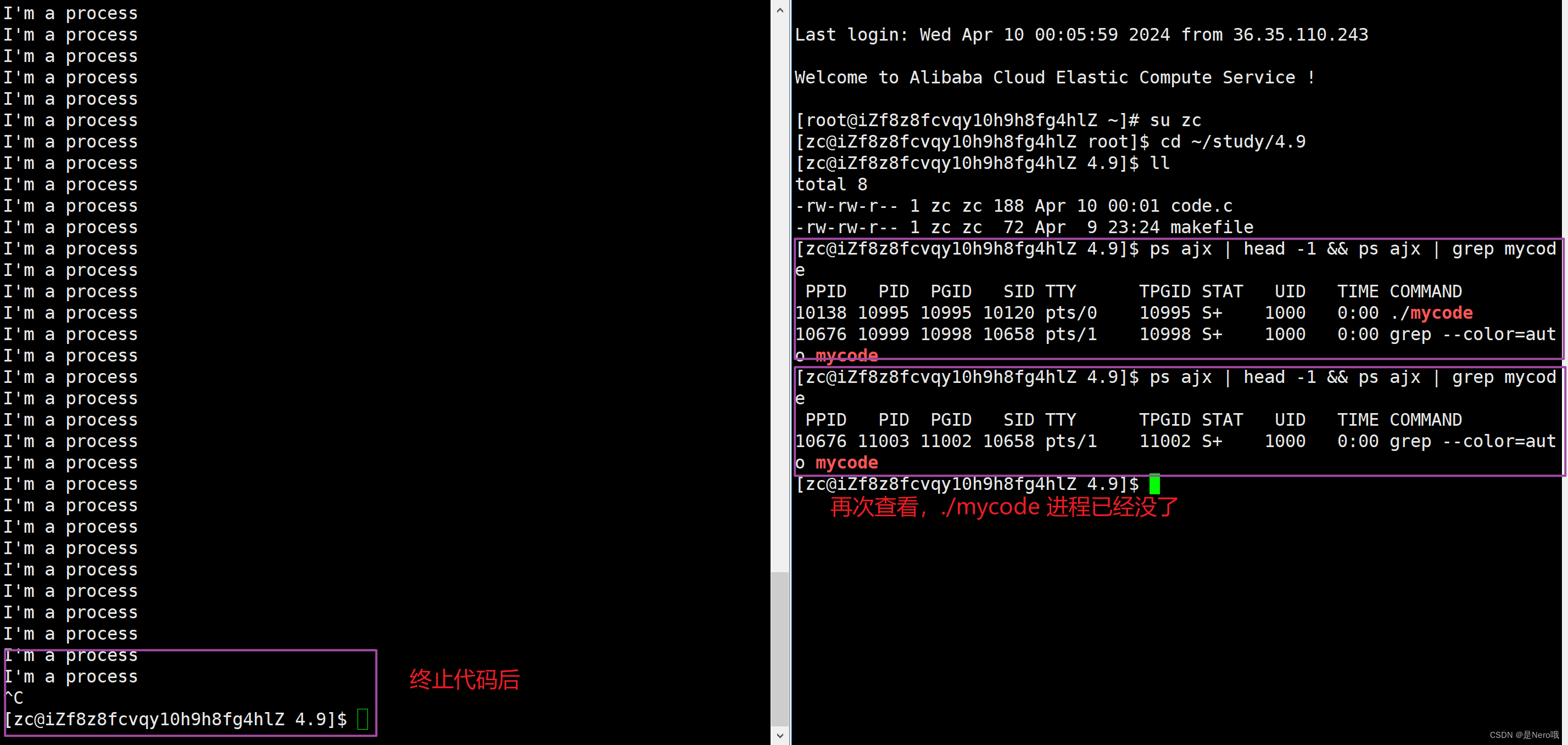 在输出中,第一个进程是你的可执行文件 mycode 的进程,第二个进程是由于你使用了 grep 命令进行字符串匹配而产生的 grep 进程
