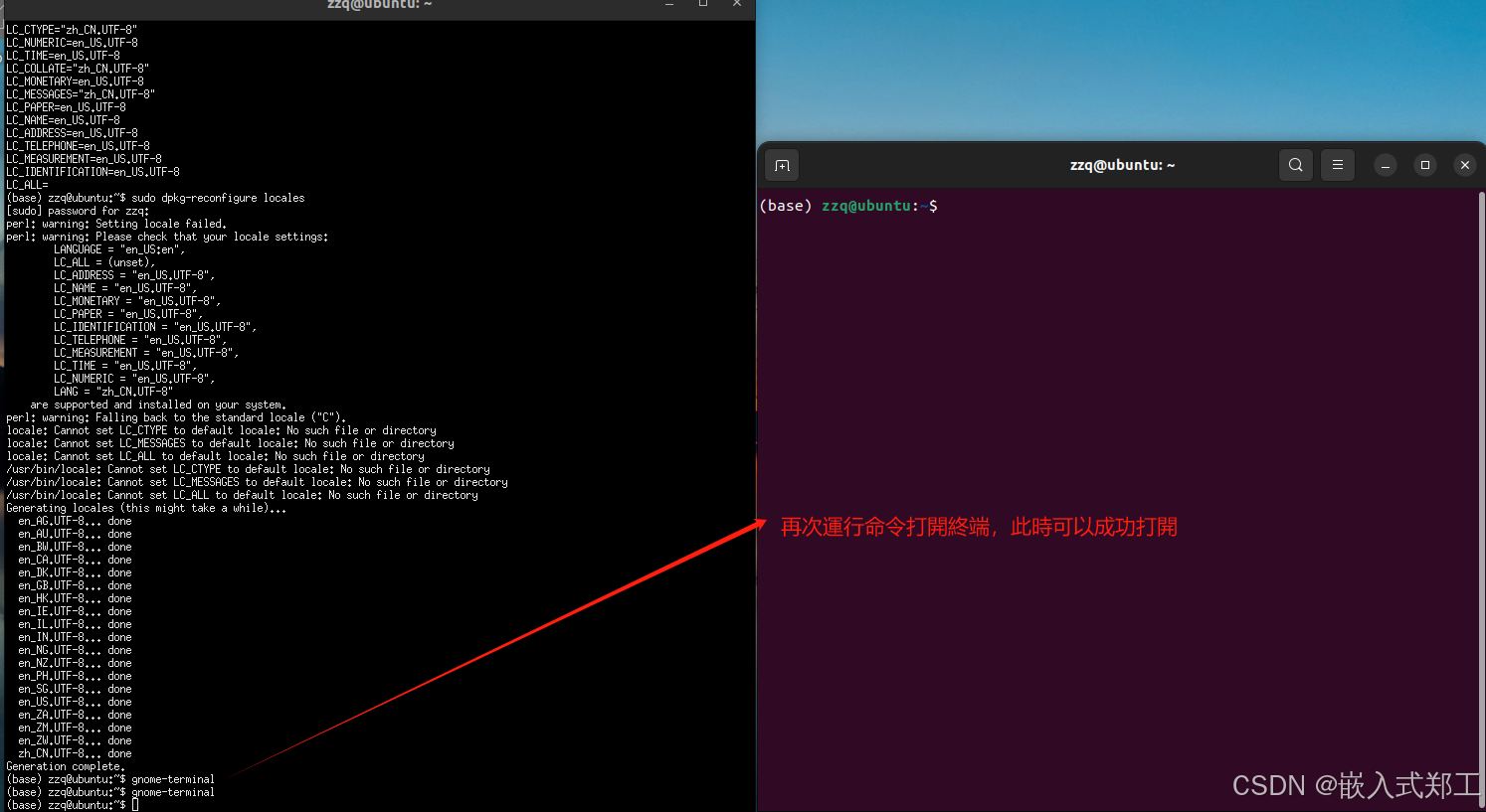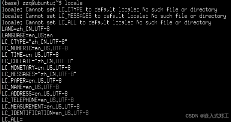 再次执行locale命令,如果此时没有类似Cannot set XXX to default locale这种报错,那么你应该就可以正常打开终端了,如下图所示