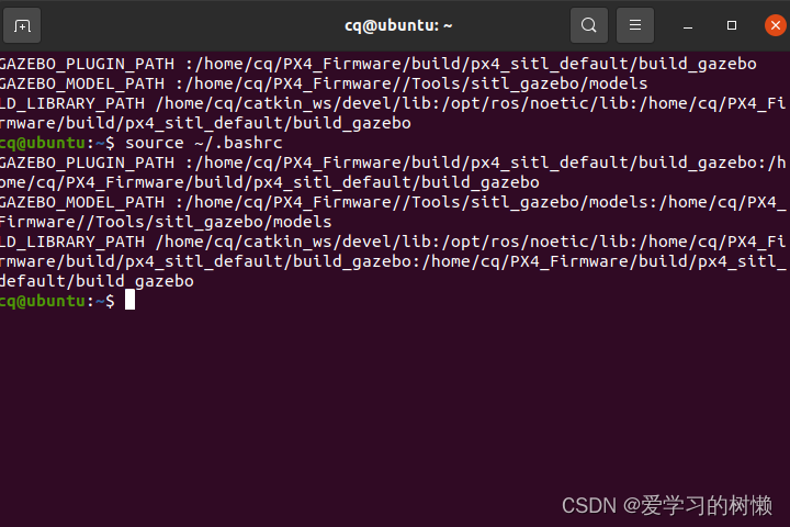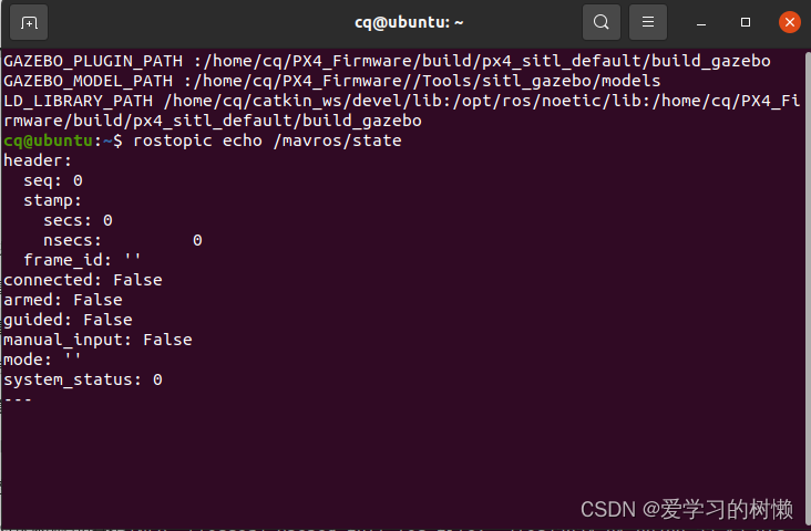 若connected: True,则说明MAVROS与SITL通信成功。如果是false,一般是因为.bashrc里的路径写的不对,请仔细检查。(正确应为下图所示)