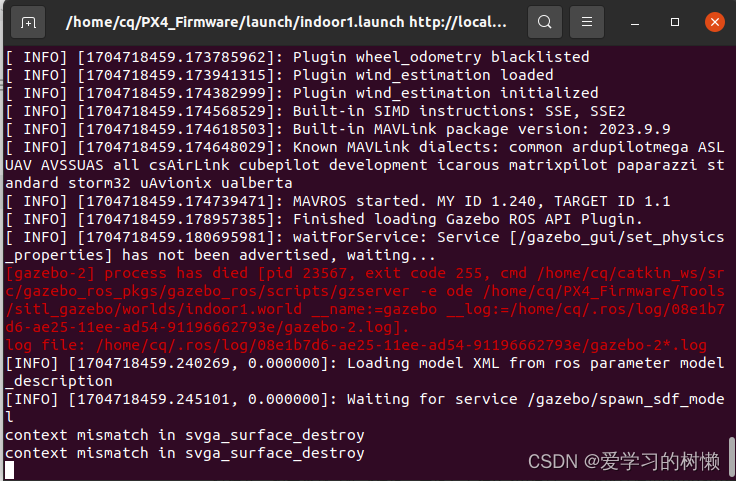 解决办法:用ctrl+c关闭仿真进程,有可能没有把Gazebo的相关进程关干净,这样再启动仿真时可能会报错。如果出现这种情况,可以用killall -9 gzclient,killall -9 gzserver 这两个命令强行关闭gazebo所有进程。