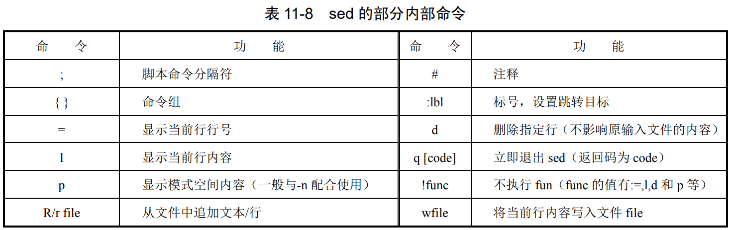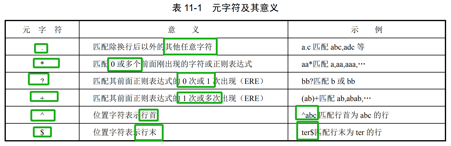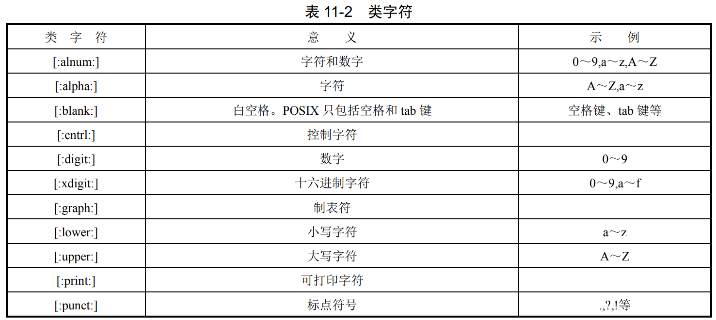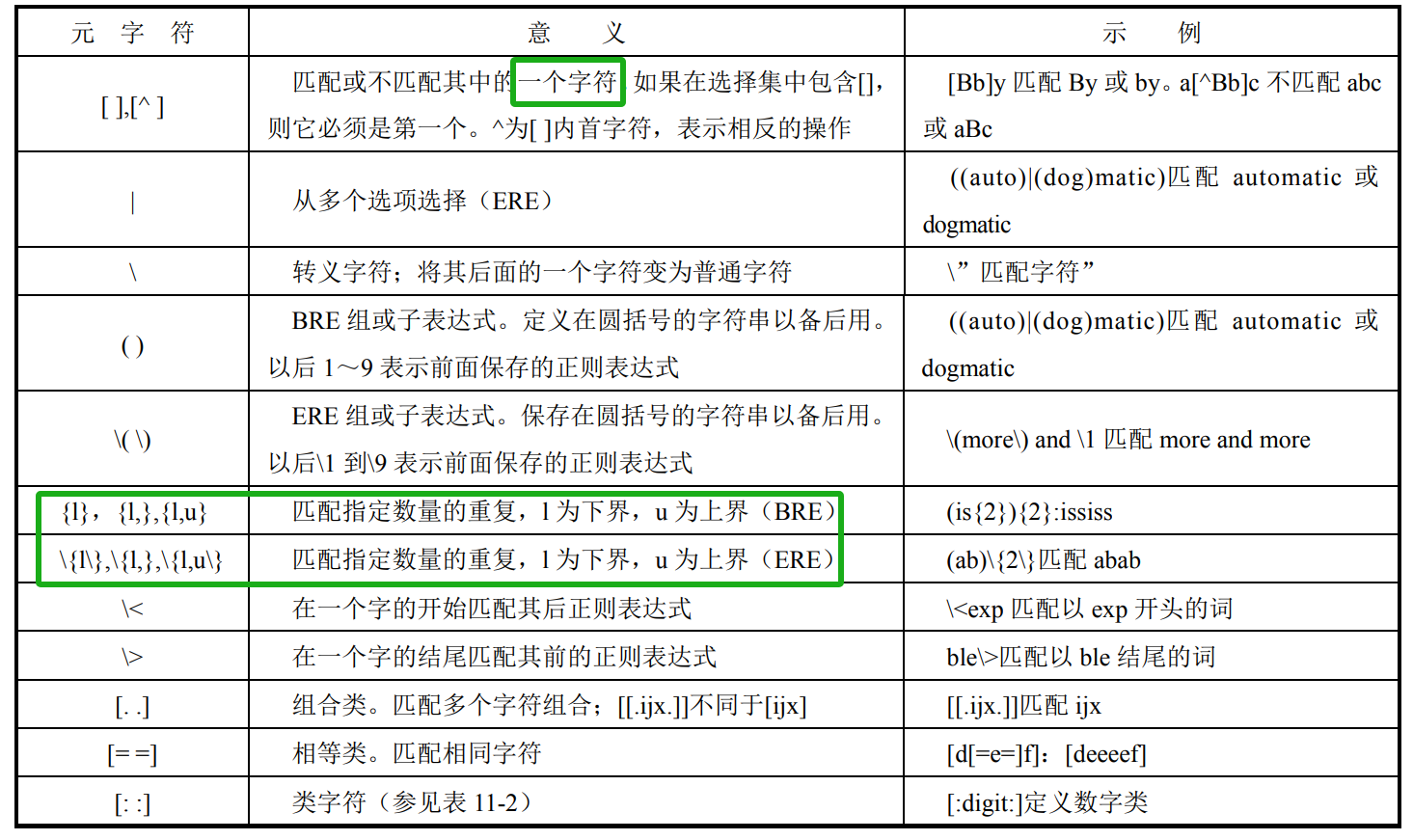 (3)[ ]:每次只匹配“[]”中字符的一个。方括号中的字符范围可以由直接给出的字符组成,也可以由表示限定范围的起始字符、终止字符及中间的连字符“-”组成。例如,f[a-d]与 f[abcd]的作用相同。[ ]内的第一个字符若为“^”或“!”,表示非运算,意为不匹配[ ]内的任何字符,例如,[!a-d]或[^a-d]表示不匹配方括号内 a-d 的字符集,但匹配[ ]之外的字符集。