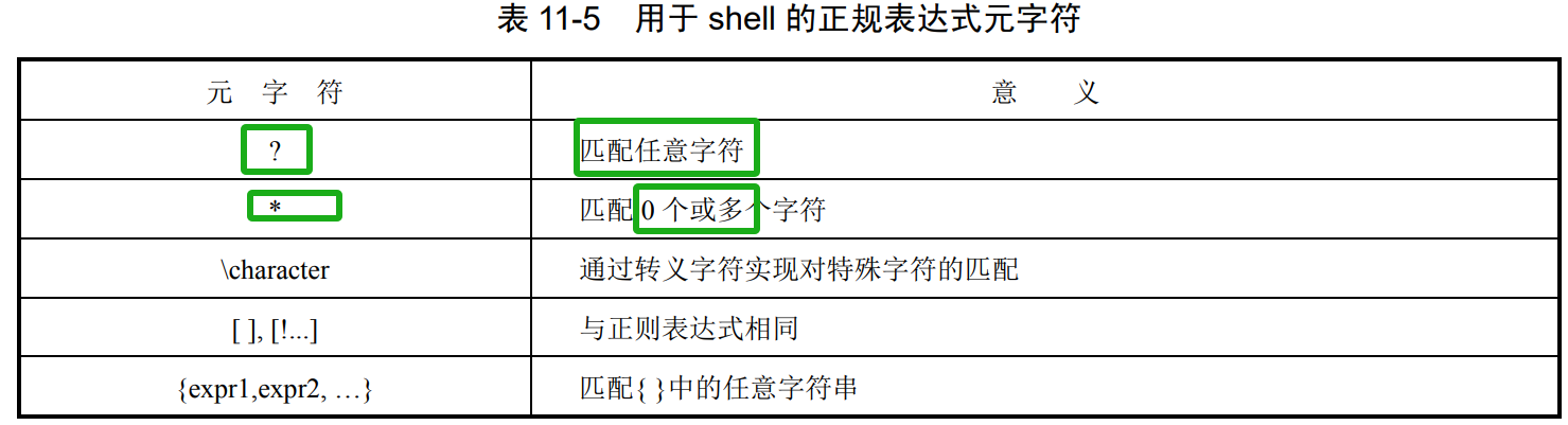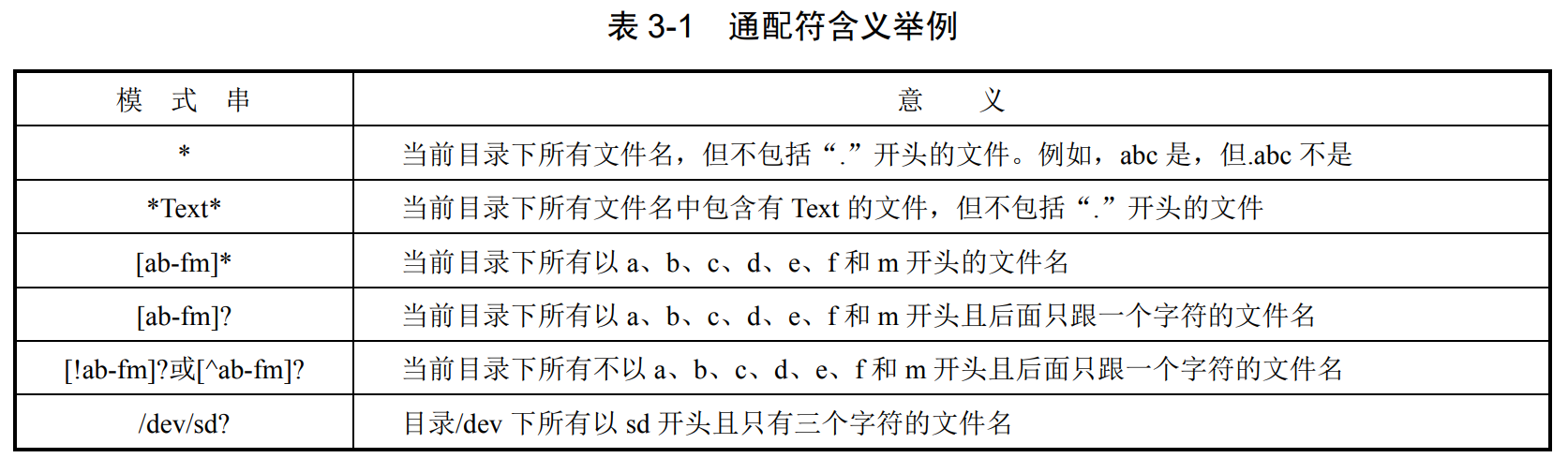 通配符用于模式匹配,如文件名匹配、路径名搜索、字符串查找等。常用的通配符有“”、“?”和括在方括号“[]”中的字符序列。用户可以在作为命令参数的文件名*中包含这些通配符,构成“模式串”,在执行过程中进行模式匹配。(1):代表从它所在位置开始的任何字符串,例如,“f”匹配以 f 打头的任意文件。但文件名前的圆点“.”和路径名中的斜线“/”必须显式匹配。例如,“*”不能匹配.file,而“.*”才可以匹配**.file**。