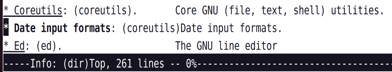 运行 info,可以在 shell 提示符后输入 info(不要参数),它将列出一个文档的清单。