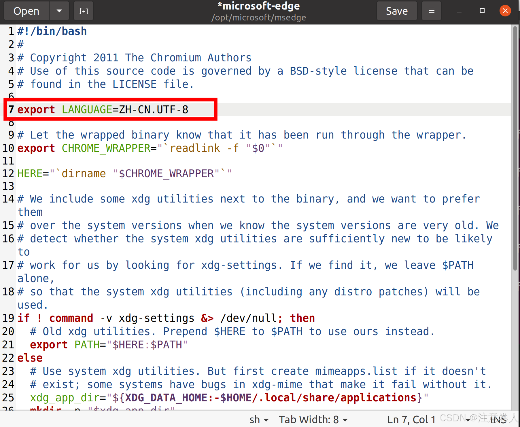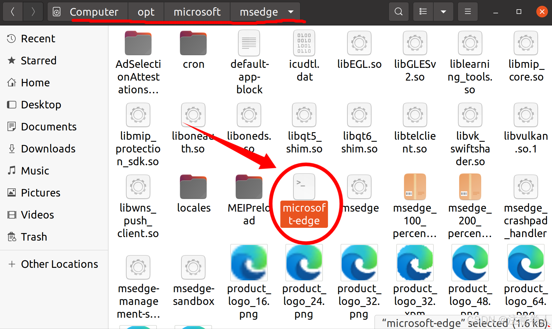 如图,如果是按照上面的dpkg安装的,那么配置文件就在/opt/microsoft/msedge目录下,如果是别的安装方式,那就找一下安装位置,我们主要是找microsoft-edge这个文件。 - 打开配置文件