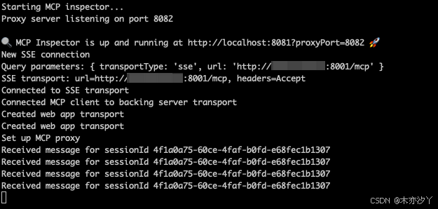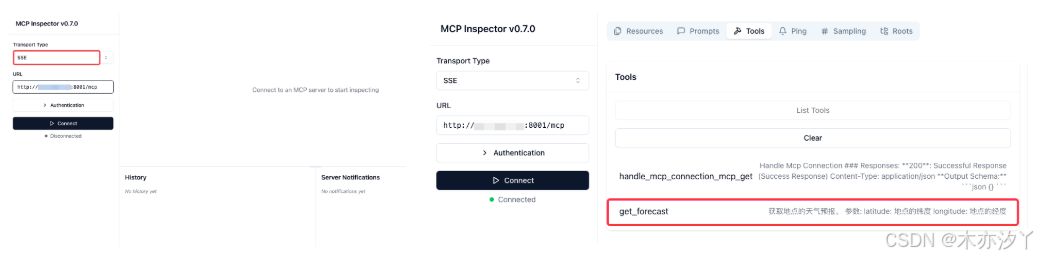 当集成了 MCP 的 FastAPI 应用运行起来后,可以用任何支持 SSE 的 MCP 客户端连接它。我们这里还是使用 mcp inspector 进行调试,通过 SSE 连接 Weather MCP 服务器。