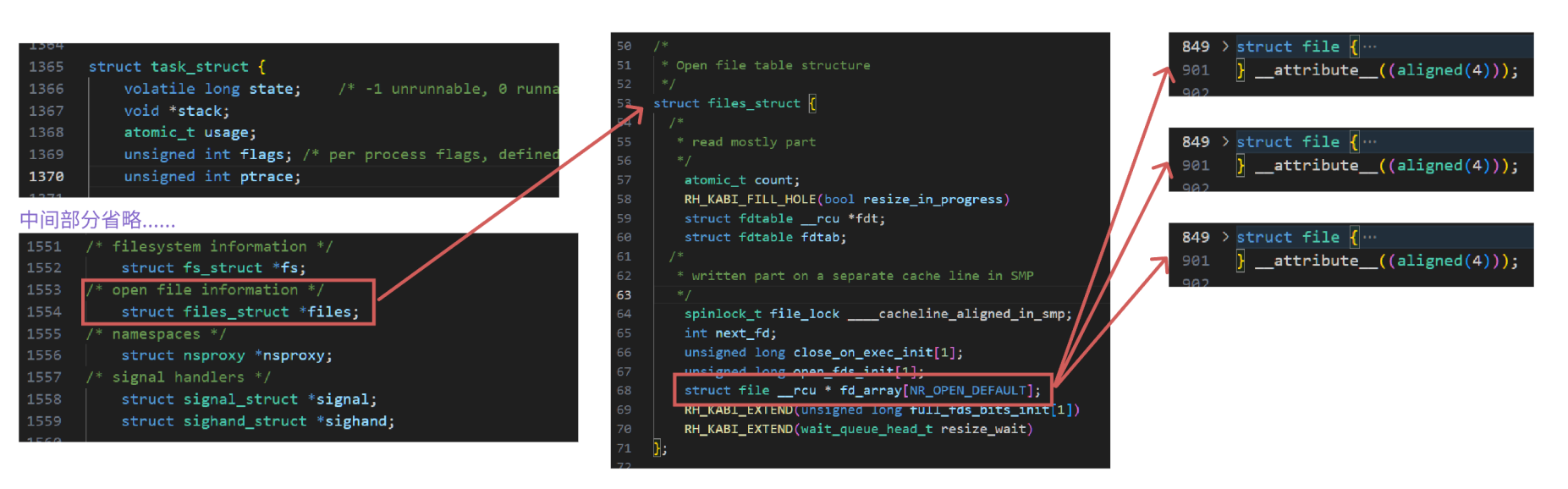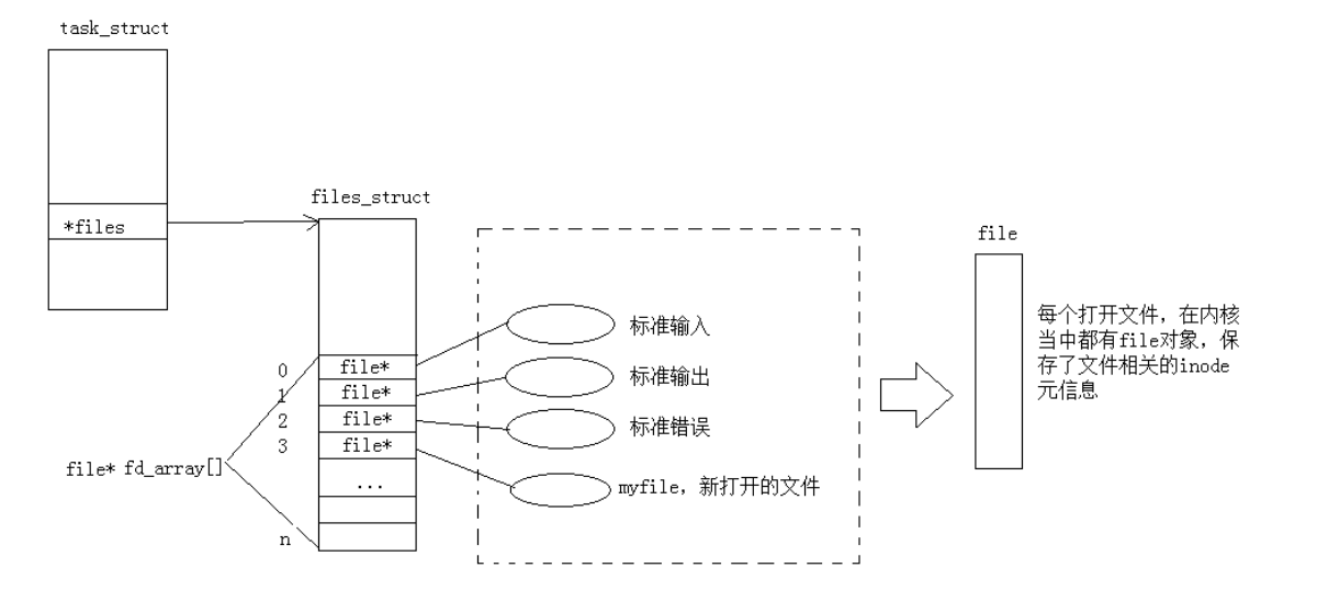 task_struct里面有一个files指针,指向文件描述表files_struct - 在文件描述表中,有