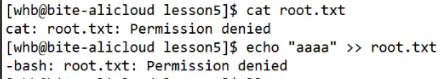 可以看到,所以现在我们的whb没法cat和echo这个root.txt,没有读写权限。但是我们居然可以把这个文件删除: