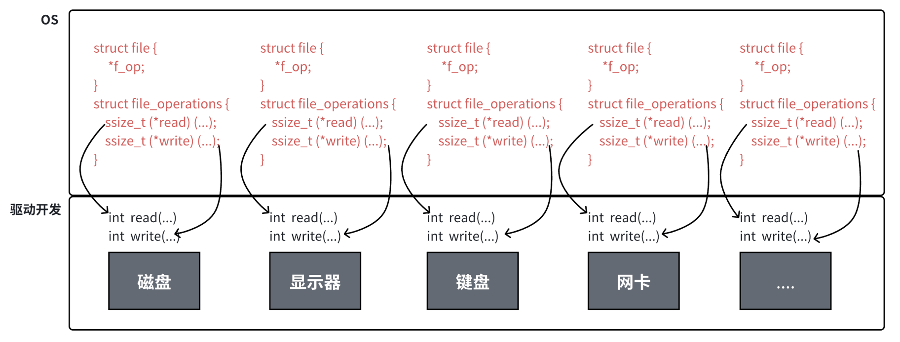 file_operations的上层(进程)而言,对设备read,都是去file_operations里面找read,操作一样(所以,一切皆文件) - 对应进程的再上层(用户),也是一切皆文件