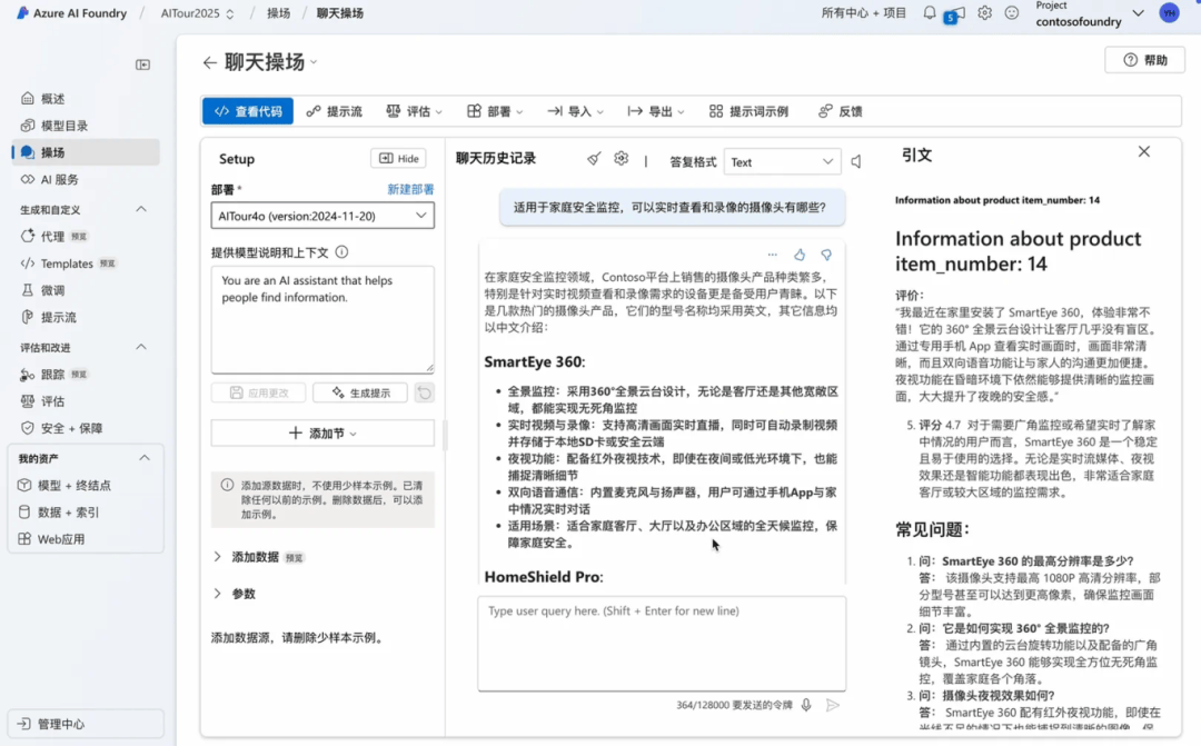 在智能家居领域,Contoso 借助 Azure AI Foundry(国际版)实现了语音交互的飞跃式创新,为消费者带来了前所未有的用户体验。当语音遇上智能体,用户只需通过简单的语音指令,就能获得智能助手全面且实用的产品推荐,还能实时切换语言,通过可视化界面深入了解产品信息。这种全方位的交互体验不仅增强了用户的信任感和购买决策力,也为智能家居市场树立了新的标杆。