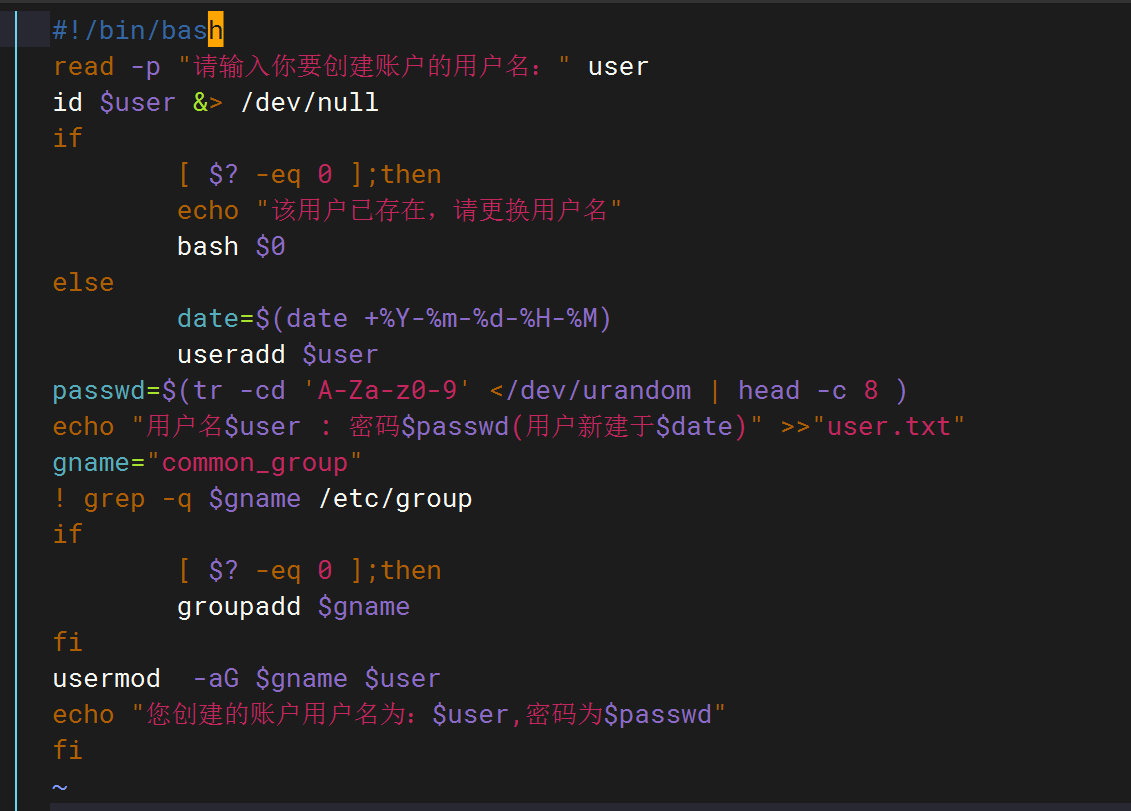 接受一个用户名为参数,如果该用户不存在,则创建这个用户,并设置一个随机生成的 8 位包含大小写字母和数字的密码(可借助相关命令或工具实现随机密码生成)。将用户信息(用户名和密码)追加到一个名为