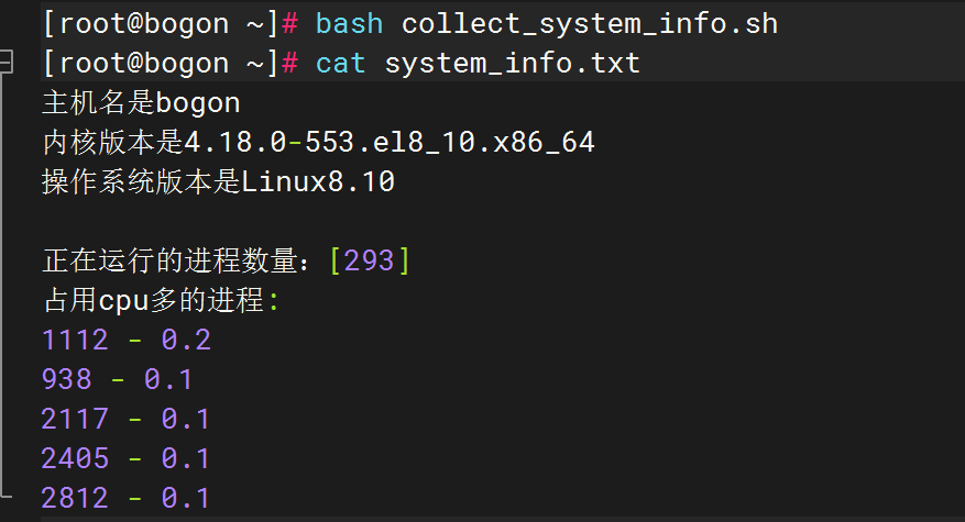 编写一个脚本名为 collect_system_info.sh,实现以下功能: