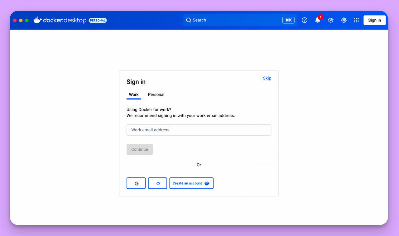 点击“启动台”的 Docker 图标后,首次打开会要求你登录 Docker 账号,直接登录即可。