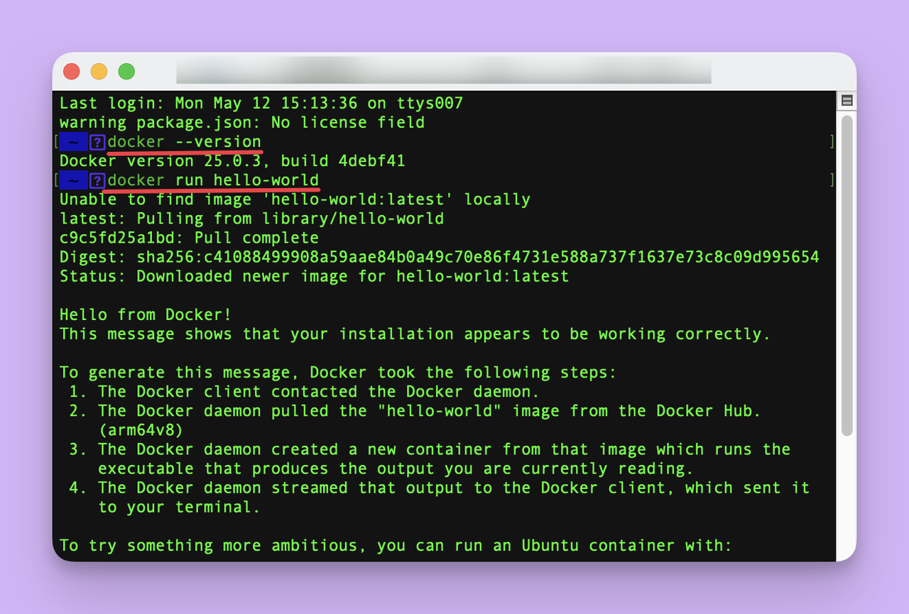 如果终端输出欢迎信息,说明 Docker 安装成功。