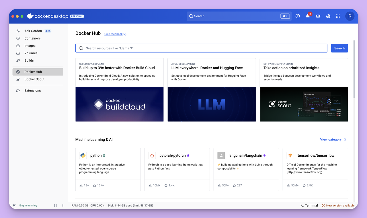 登录进来后,你可以在侧边栏的“Docker Hub”中搜索相关的镜像,然后安装即可。