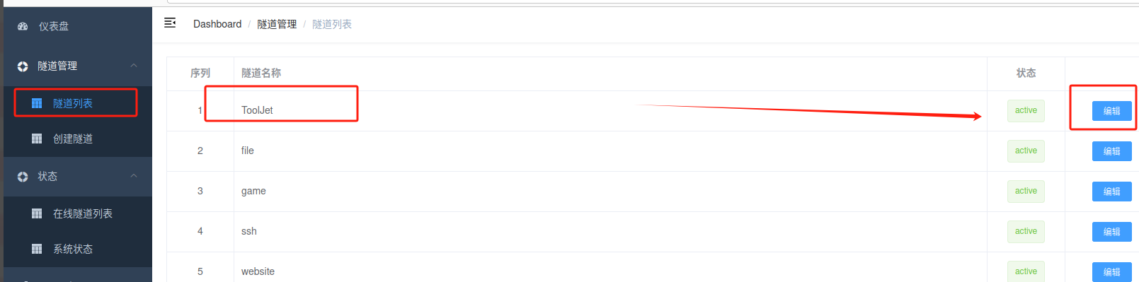 登录cpolar web UI管理界面,点击左侧仪表盘的隧道管理——隧道列表,找到所要配置的隧道toolJet,点击右侧的编辑。
